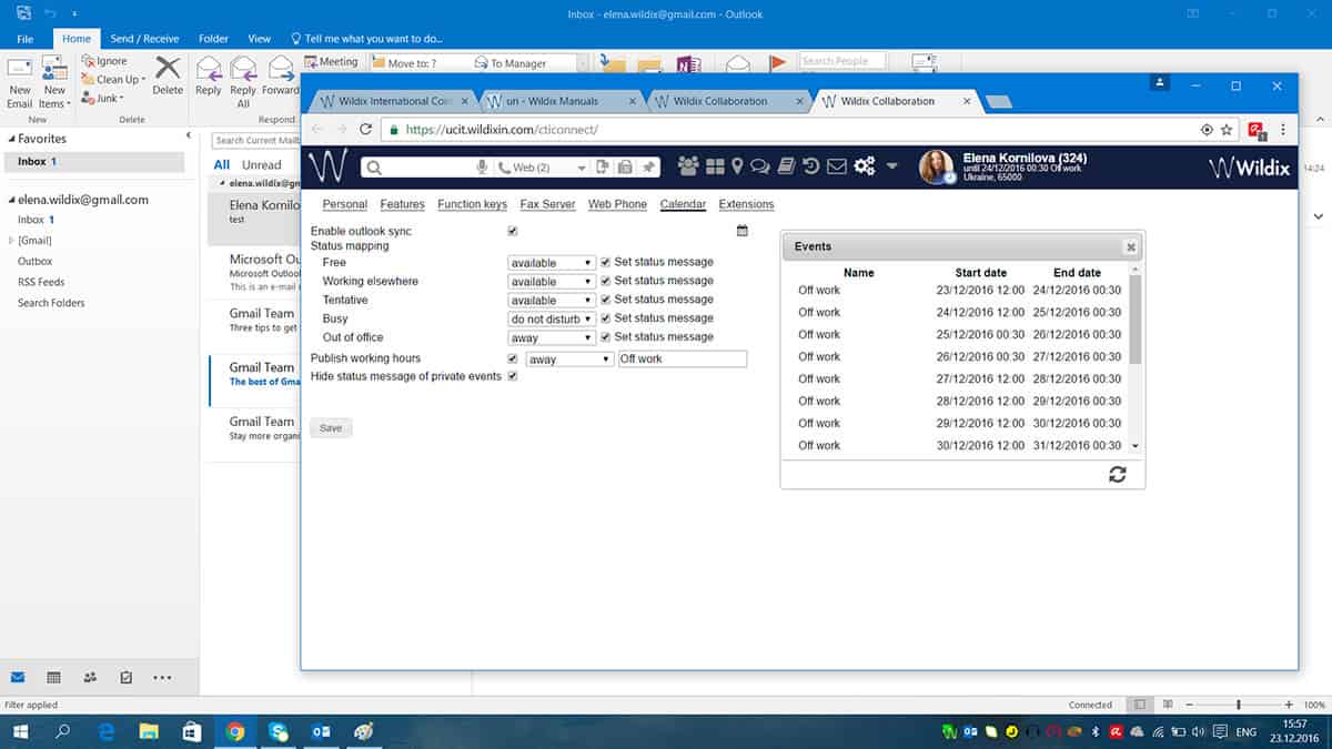 - Synchronisation mit dem Outlook-Kalender: Basierend auf den Einträgen in Ihrem Outlook-Kalender können Ihre Kollegen sehen, wann Sie abwesend / nicht erreichbar / beschäftigt sind; das System leitet hereinkommende Anrufe entsprechend Ihrem Terminstatus in Ihrem Outlook-Kalender weiter.