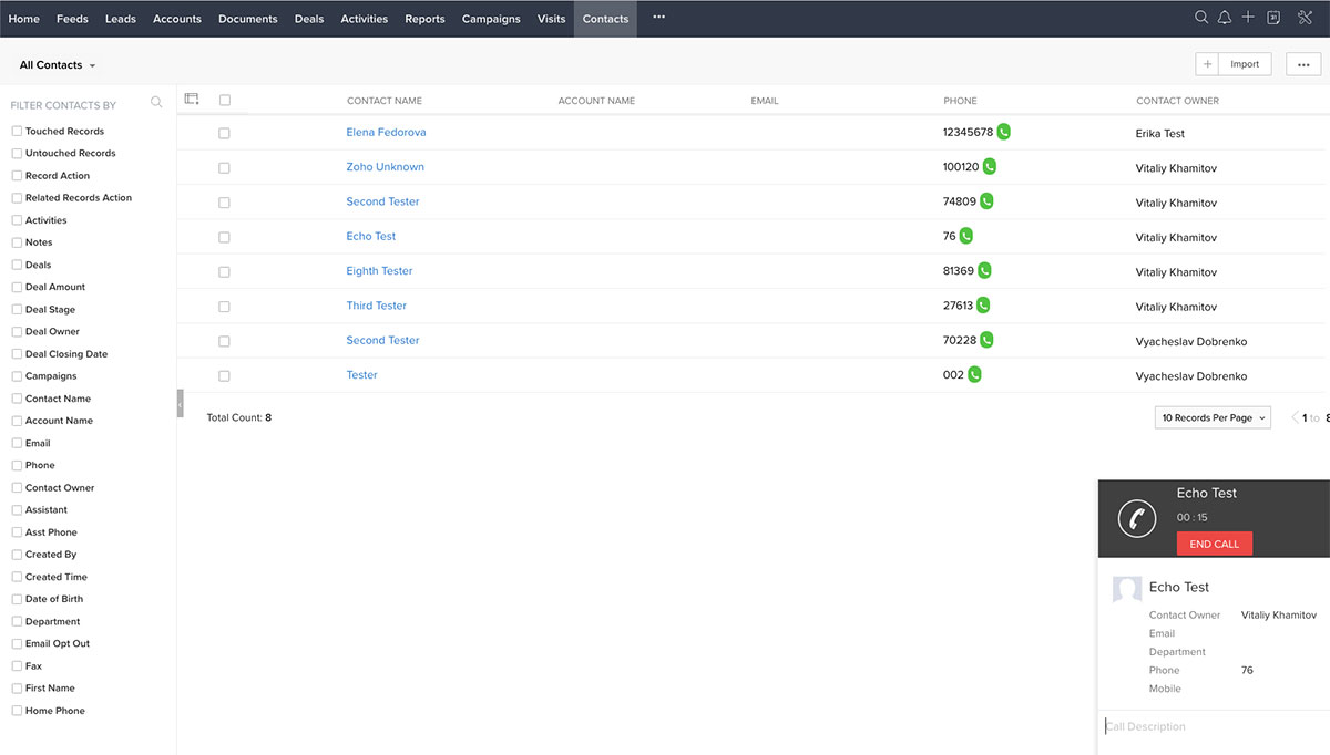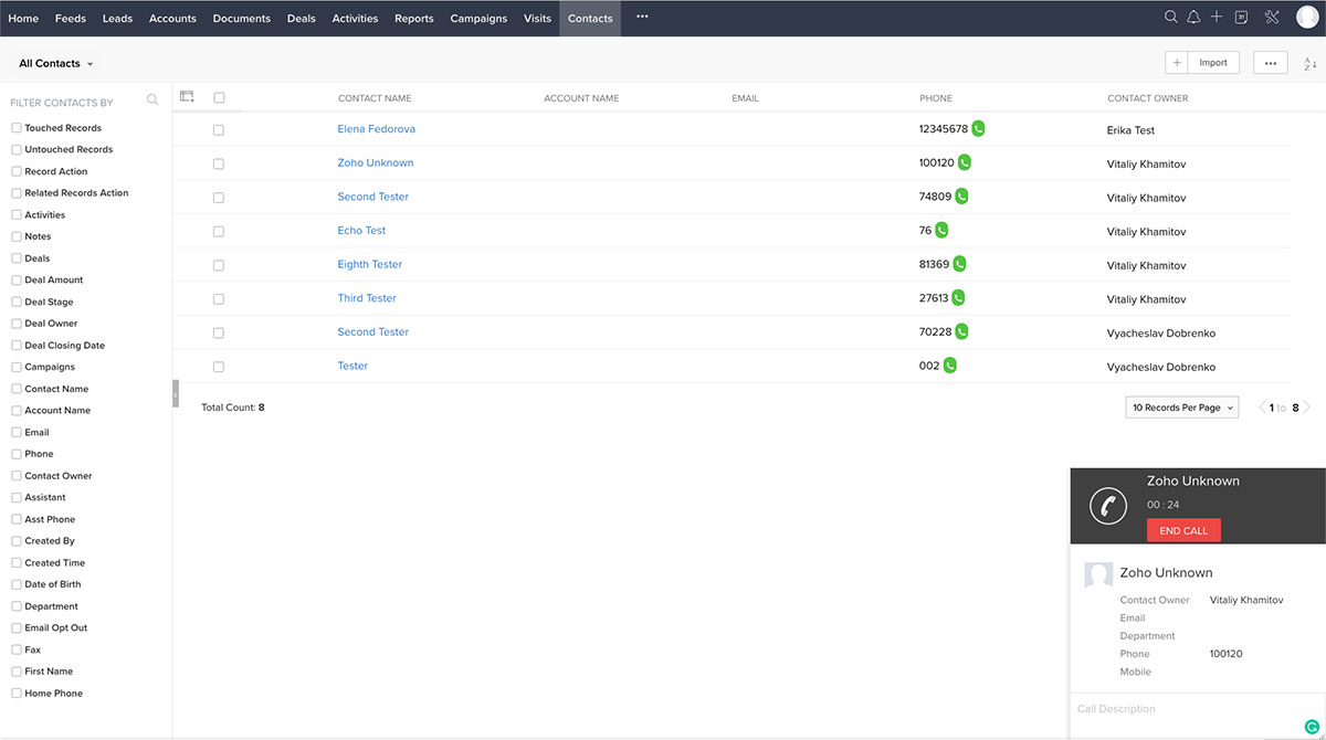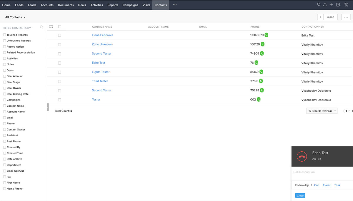 To start using all the features of the Wildix integration for Zoho CRM, you should import users from Zoho CRM into your Wildix system and enable the integration on the Wildix side. Once the setup is done you can start managing your call activities within your CRM account.